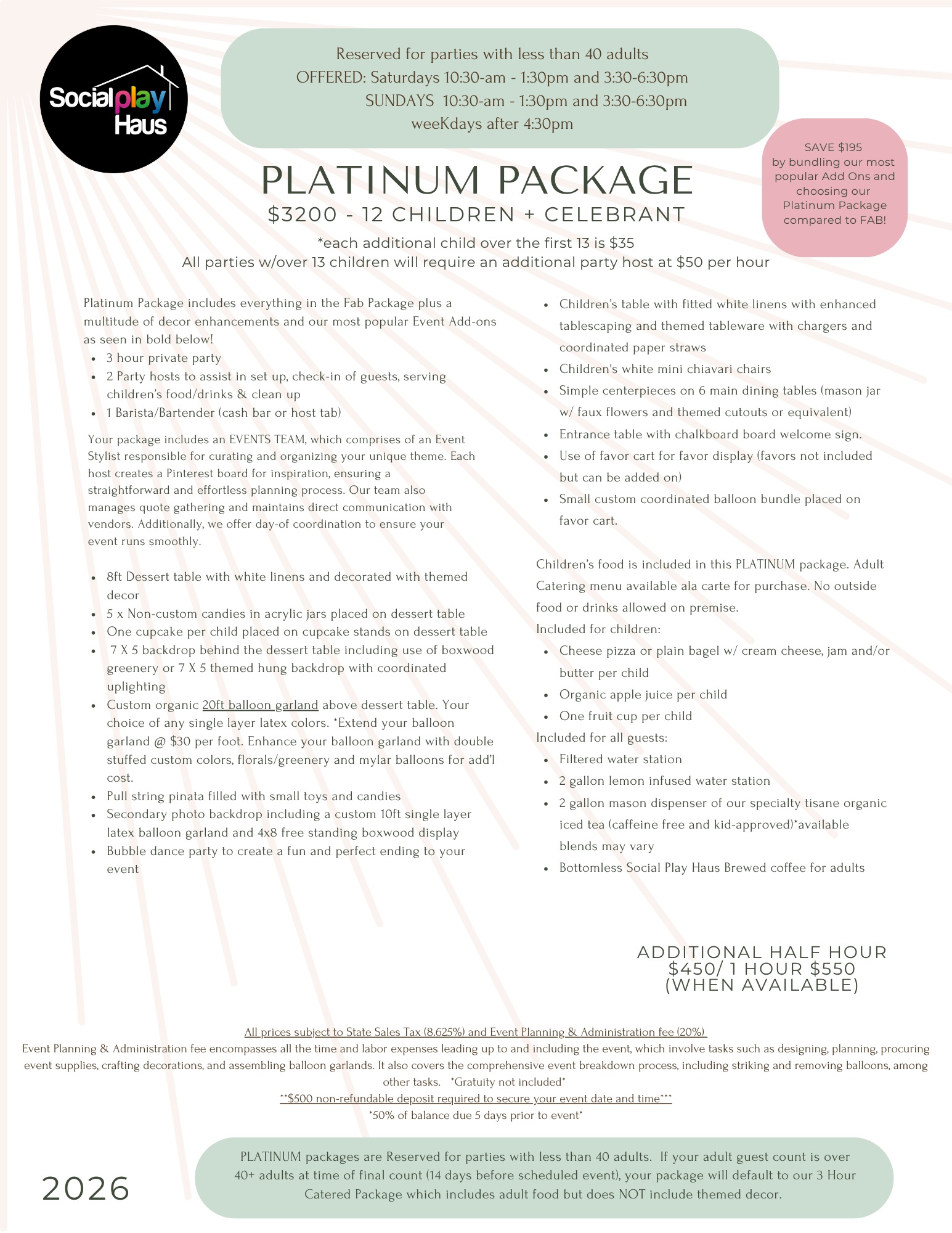 Everything from Custom Fab & Platinum plus premium features. (Includes 12 children + celebrant; add’l $35 per child.)