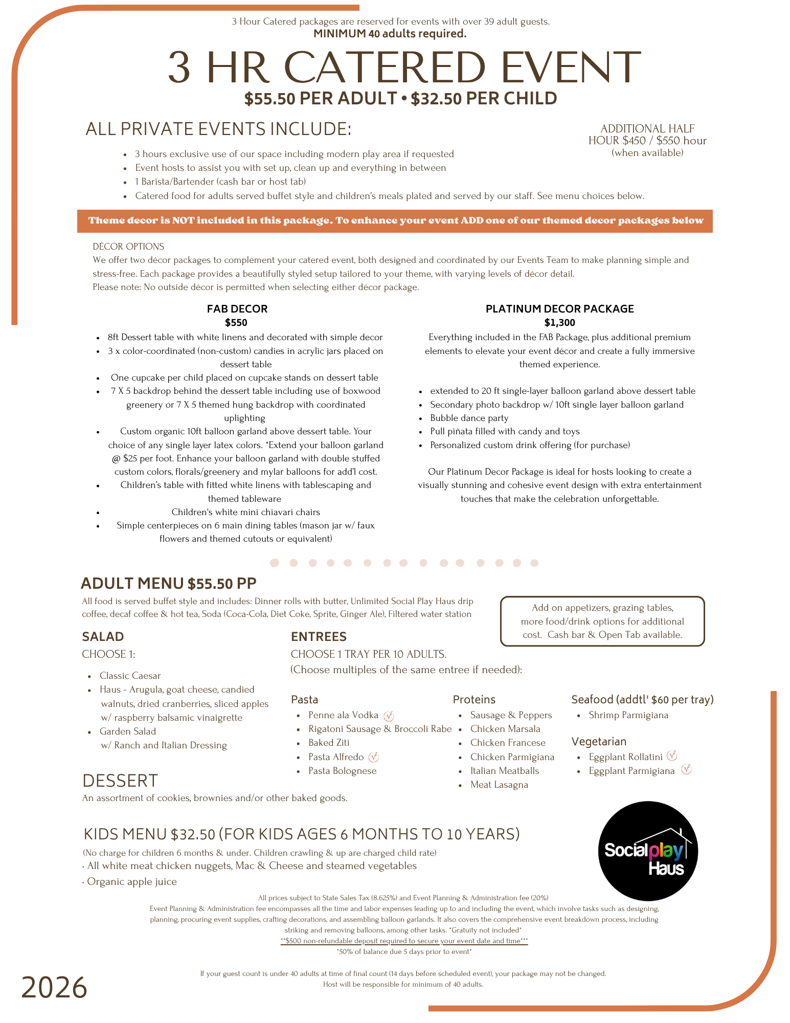 Per person pricing for larger events (40+ adults). Contact us for menu options and dietary accommodations.